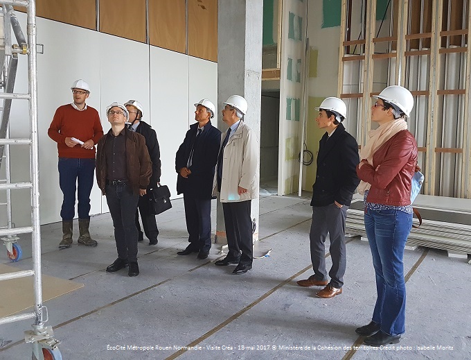 Le 18 mai dernier, une visite a été organisée par la Métropole Rouen Normandie afin de présenter le futur siège de l’EPCI aux représentants nationaux et régionaux du ministère de la cohésion des territoires chargé du pilotage de la démarche ÉcoCité et de la Caisse des Dépôts, opérateur du fonds Ville de demain. En l’occurrence cette opération de 25 M€ bénéficie d’un appui financier du Programme d’Investissements d’Avenir Ville de demain à hauteur de 4,5 M€. Construit pour regrouper les services de la Métropole et rationaliser ses implantations immobilières, le bâtiment, qui accueillera 350 agents fin juin, rassemble un ensemble d’innovations technologiques exemplaires. En effet, celui-ci est labellisé Passivhaus®, et atteindra un très haut niveau de performance énergétique (bâtiment à énergie positive, BEPOS) grâce à son isolation et sa production d’électricité (2 000 m² de panneaux photovoltaïques), ainsi que par l’usage de ses pompes à chaleur à flux réversible sur sondes géothermiques (réseau de chaleur ou réseau de rafraîchissement).